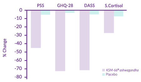 A study involving 64 subjects with a history of chronic stress were evaluated for depression, anxiety, and stress after 8 weeks of supplementing with 300 mg capsules of KSM-66® twice daily. The results showed that the KSM66® group, when compared to placebo, had a significant reduction in stress, anxiety, and depression, and a decrease in serum cortisol levels of 27.9%! (1)